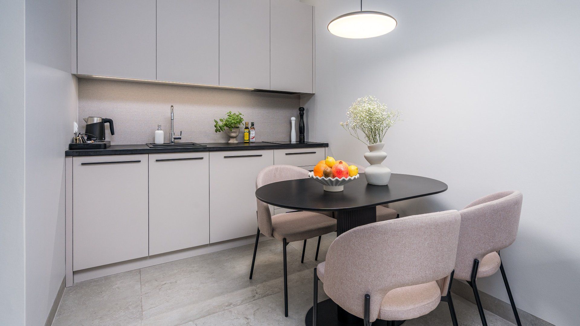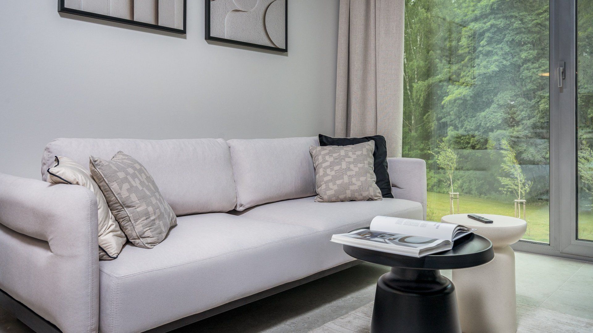 Wnętrze zostało zaprojektowane w spójnym, eleganckim stylu. Jasne kolory, naturalne materiały i subtelne detale tworzą atmosferę spokoju i harmonii. Duże przeszklenia otwierają przestrzeń na zieleń, dzięki czemu natura staje się częścią wnętrza.