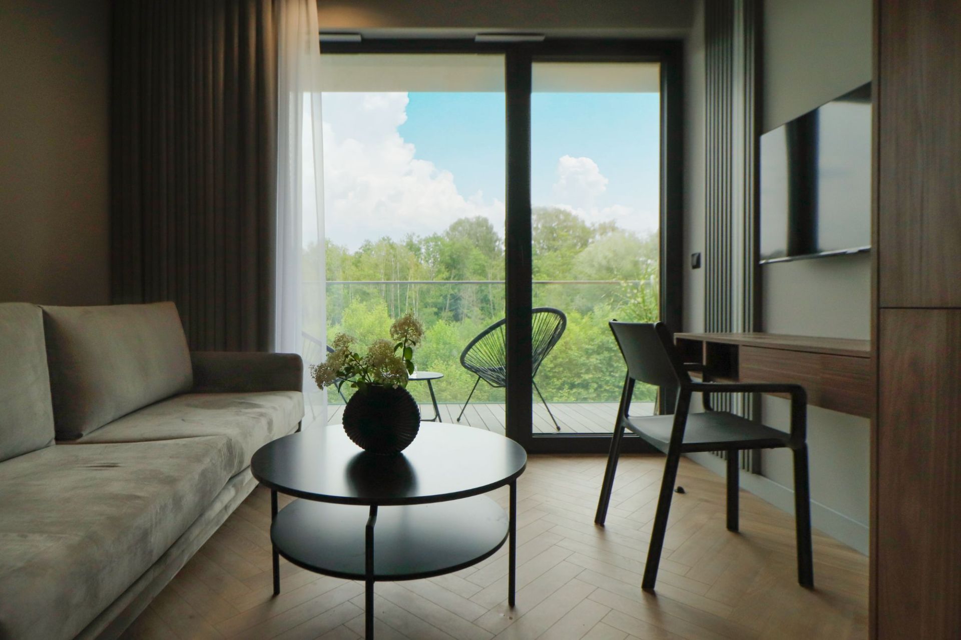Wyjątkowym atutem apartamentu jest taras, który pozwala rozpocząć dzień od spokojnej kawy na świeżym powietrzu lub zakończyć go chwilą relaksu po intensywnym dniu.