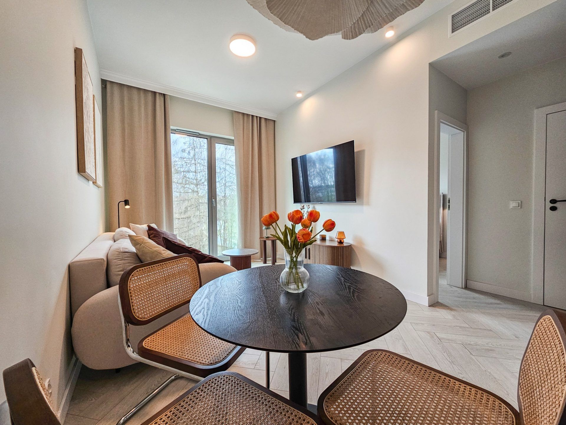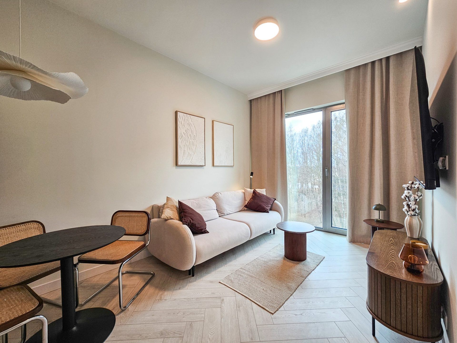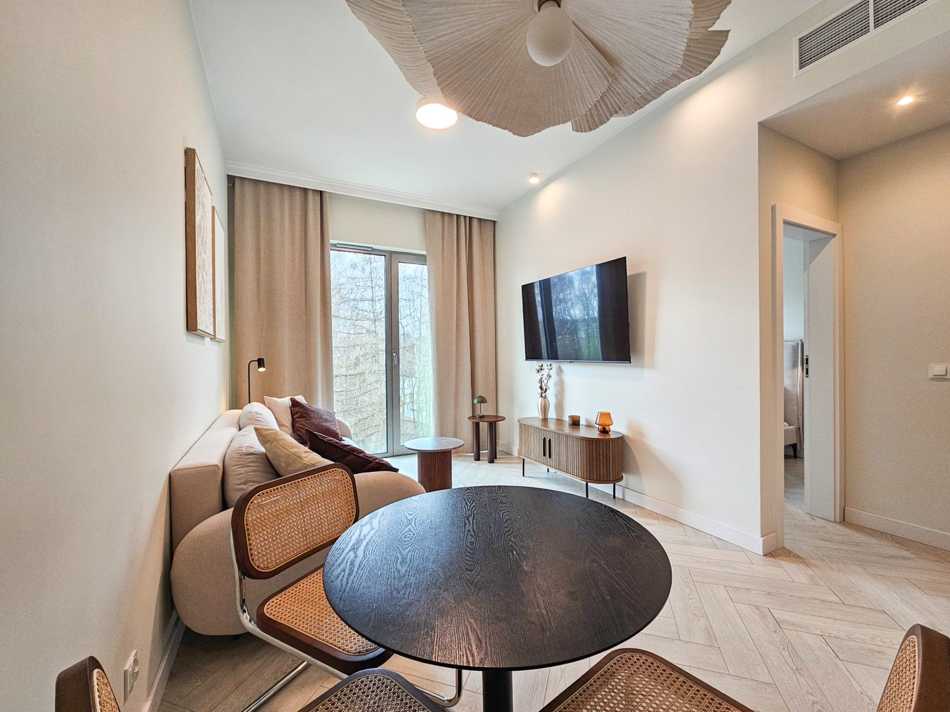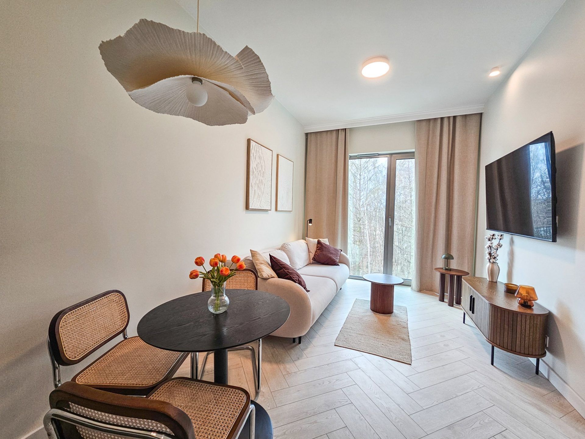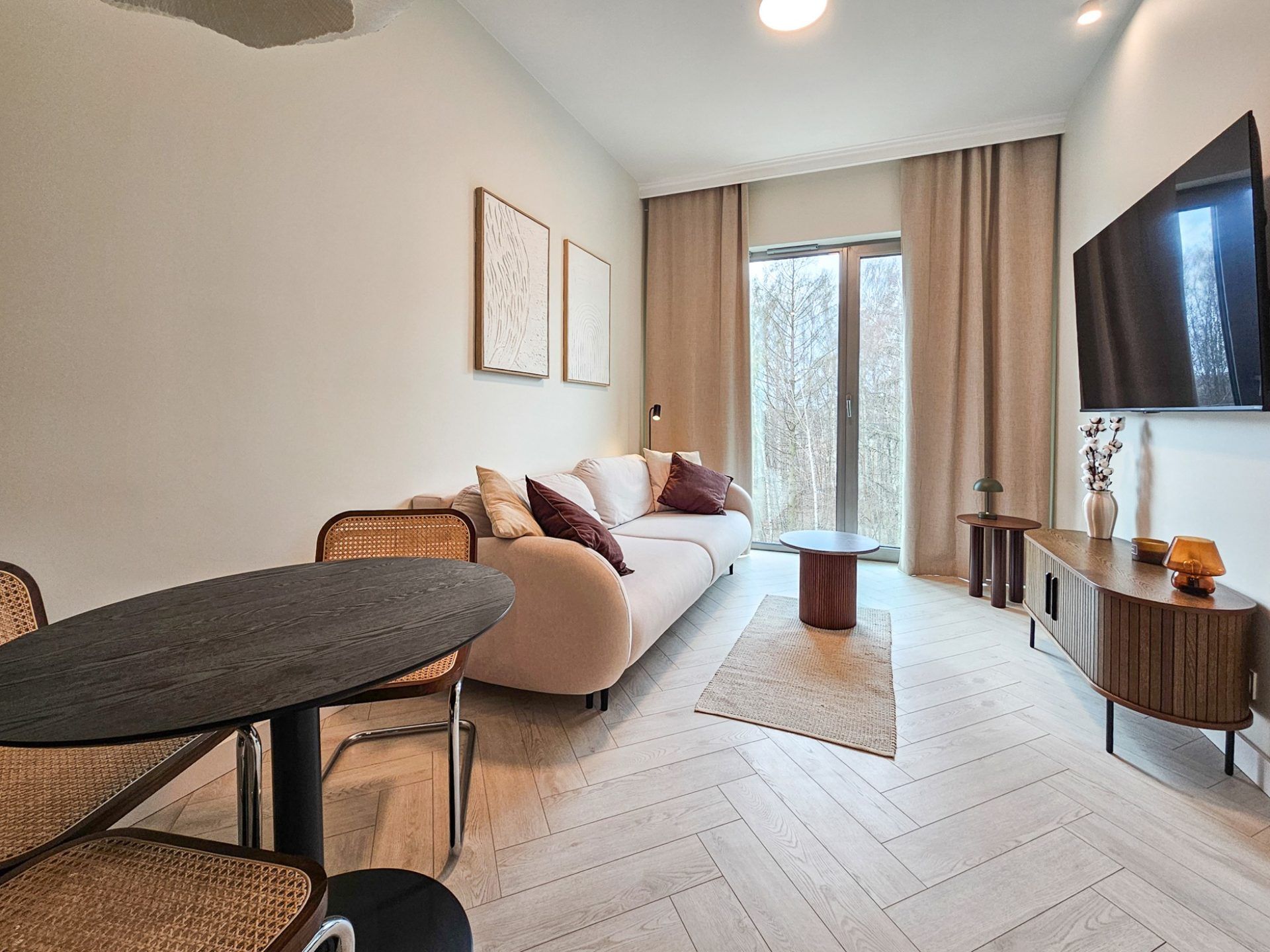 Wnętrze apartamentu utrzymane jest w spójnym, designerskim stylu. Jasna kolorystyka, naturalne drewno, starannie dobrane dodatki oraz wysokie sufity tworzą przestrzeń pełną światła i harmonii. Duże przeszklenia otwierają wnętrze na zieleń, dzięki czemu pobyt nabiera wyjątkowego, relaksującego charakteru.