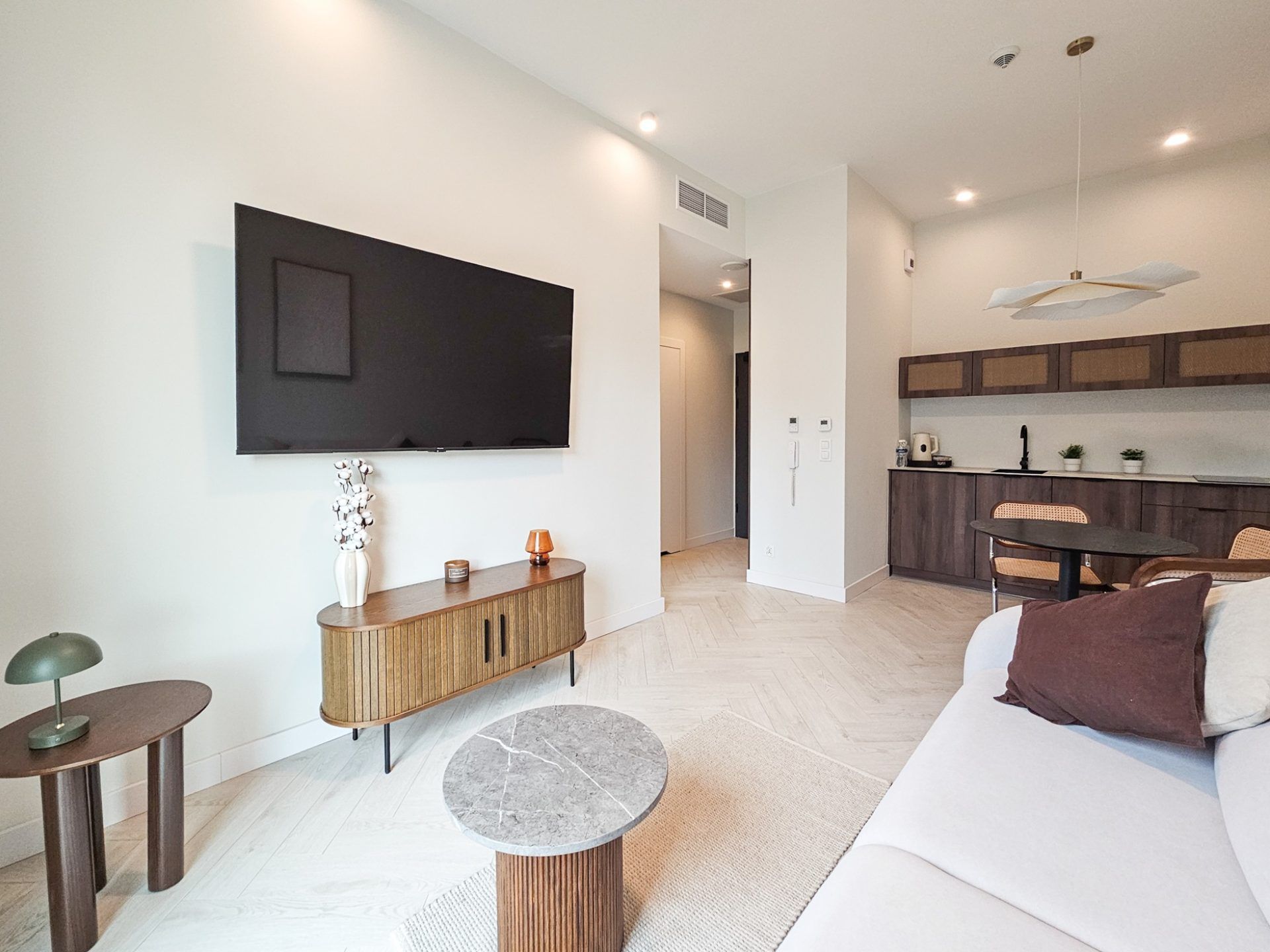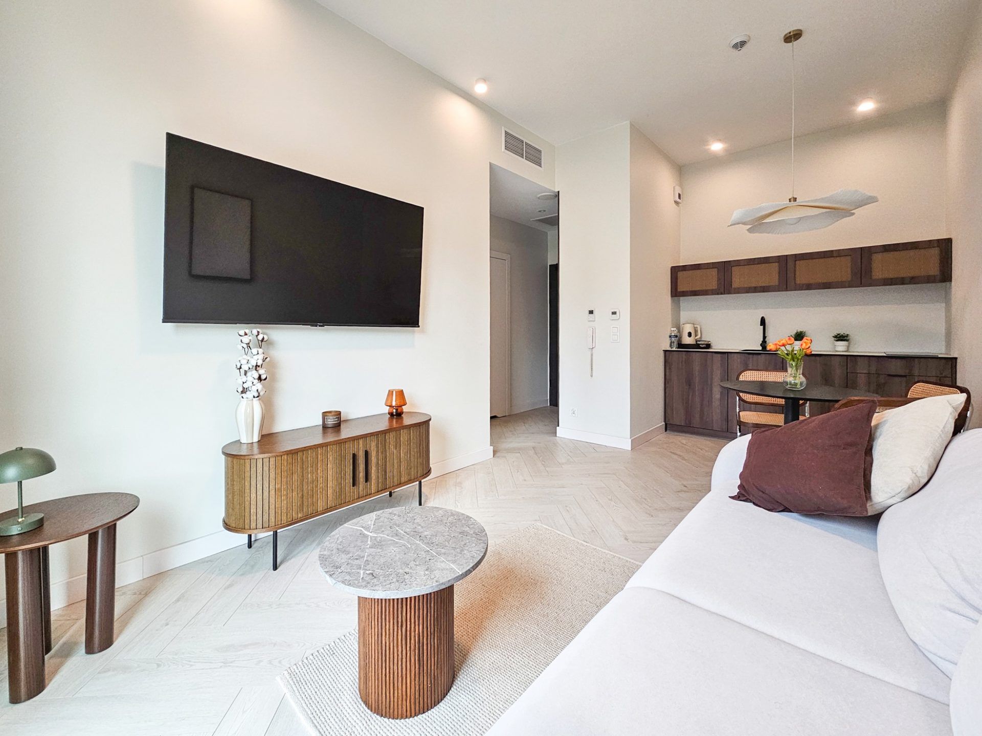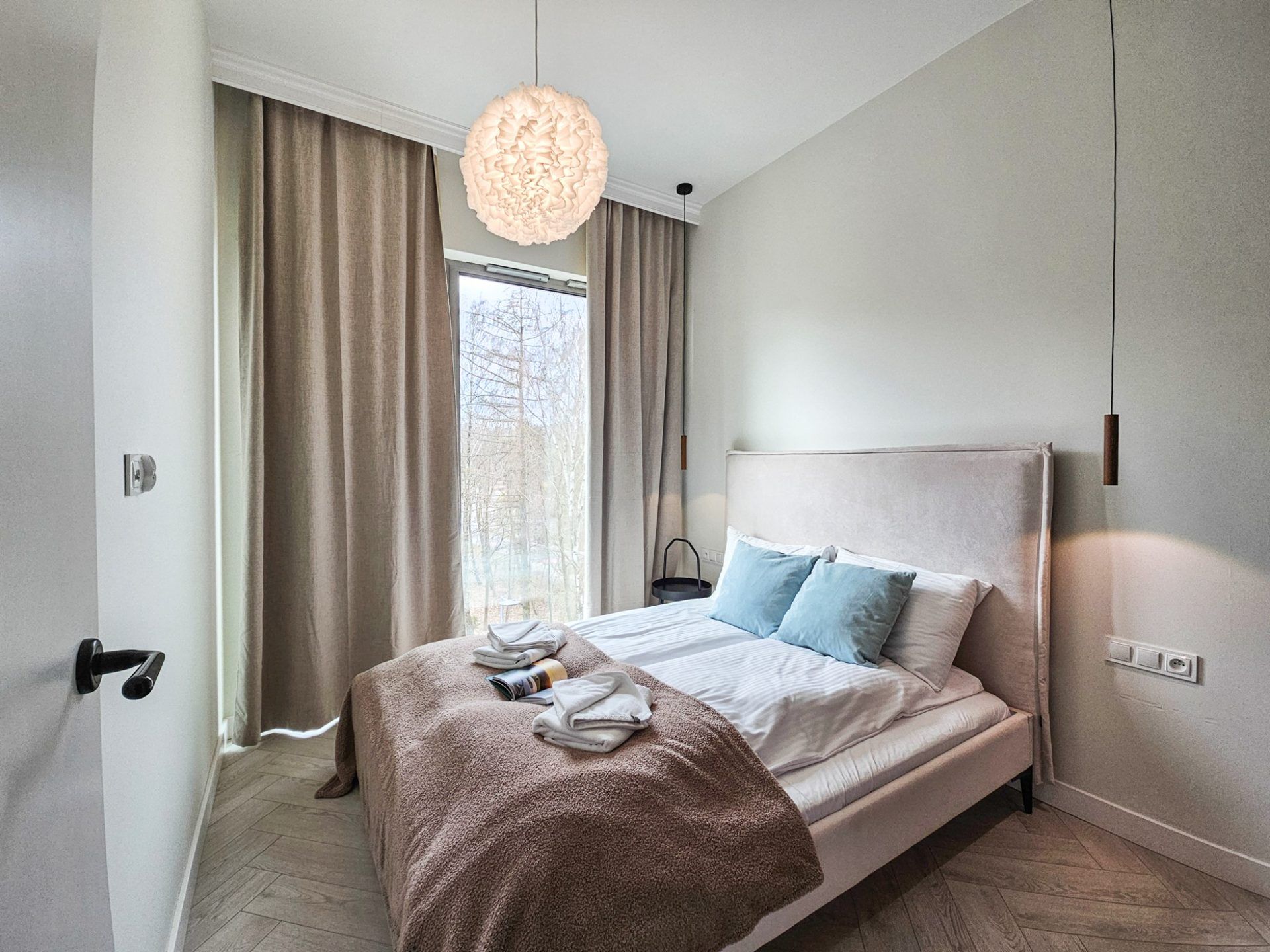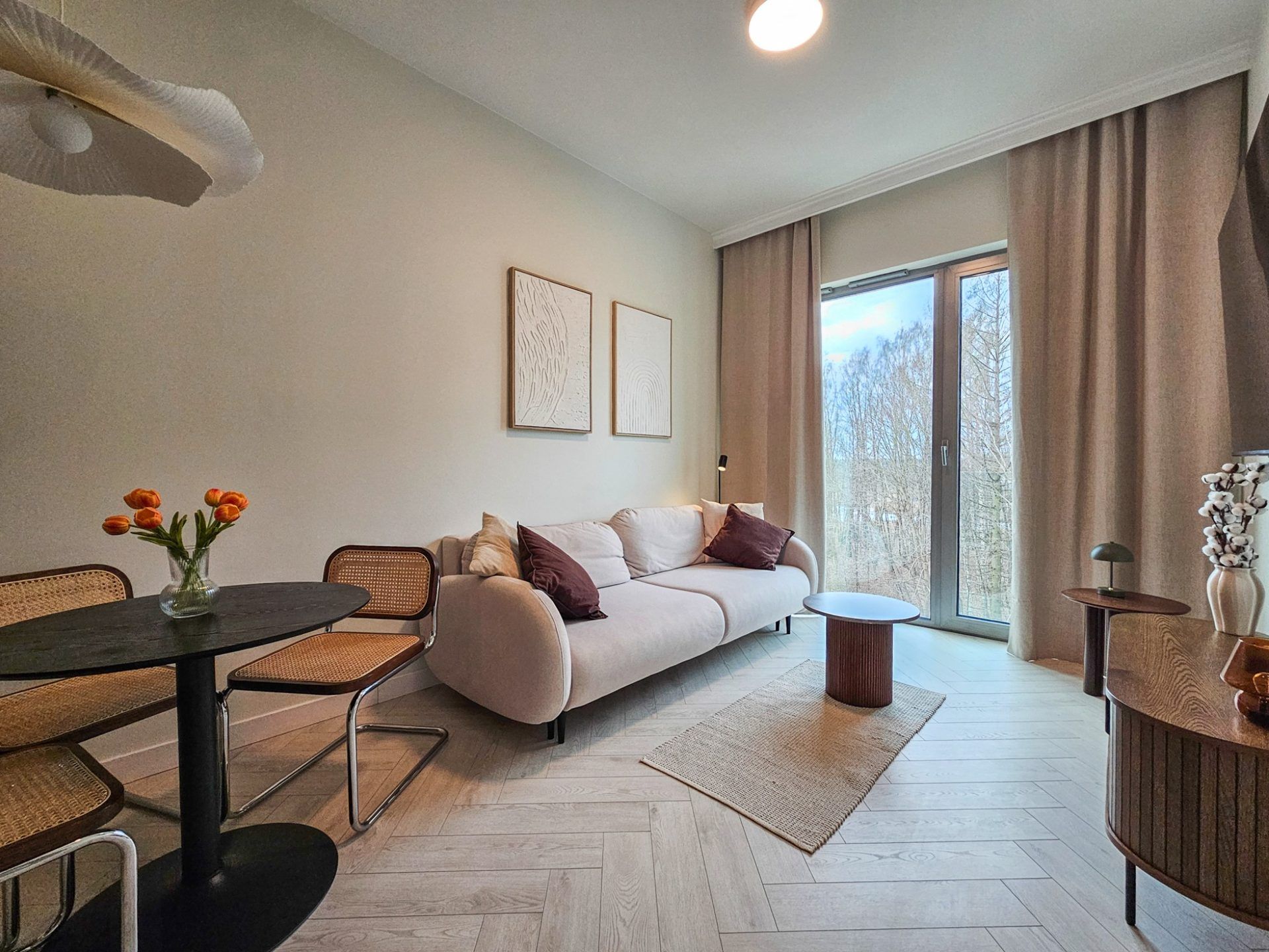 Wnętrze apartamentu utrzymane jest w spójnym, designerskim stylu. Jasna kolorystyka, naturalne drewno, starannie dobrane dodatki oraz wysokie sufity tworzą przestrzeń pełną światła i harmonii. Duże przeszklenia otwierają wnętrze na zieleń, dzięki czemu pobyt nabiera wyjątkowego, relaksującego charakteru.