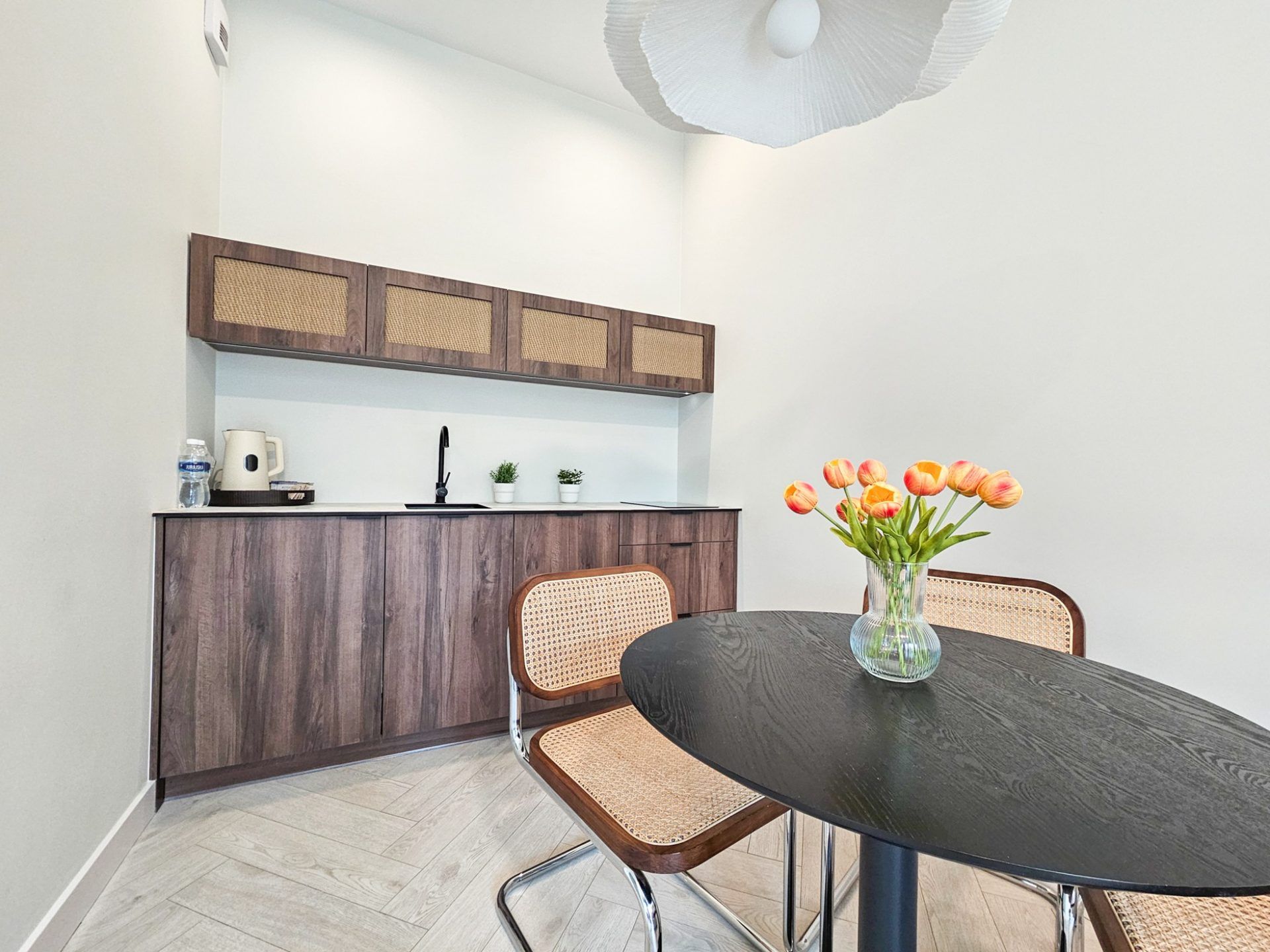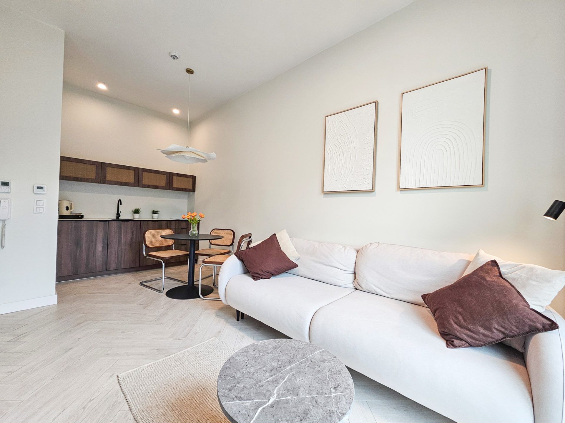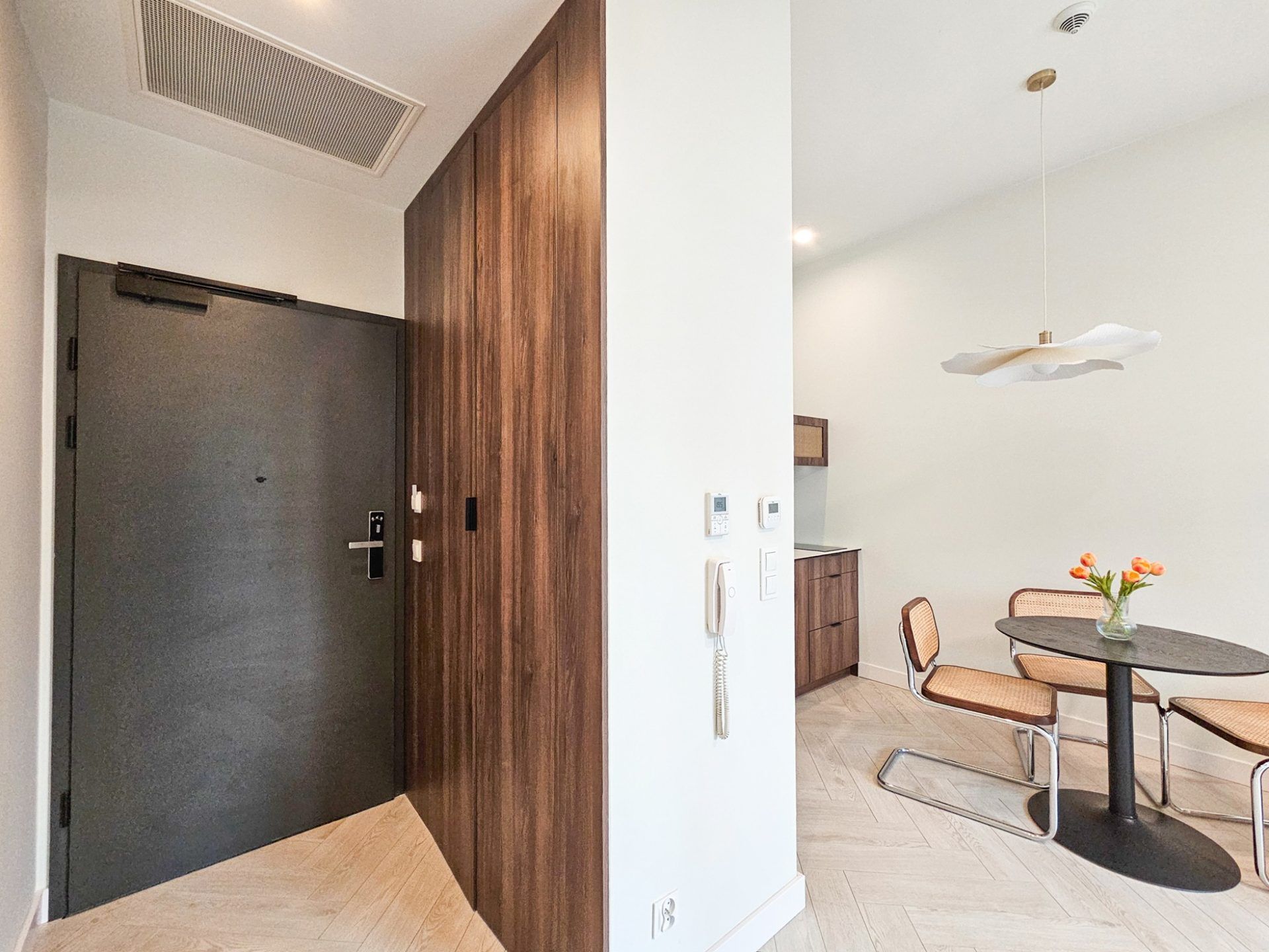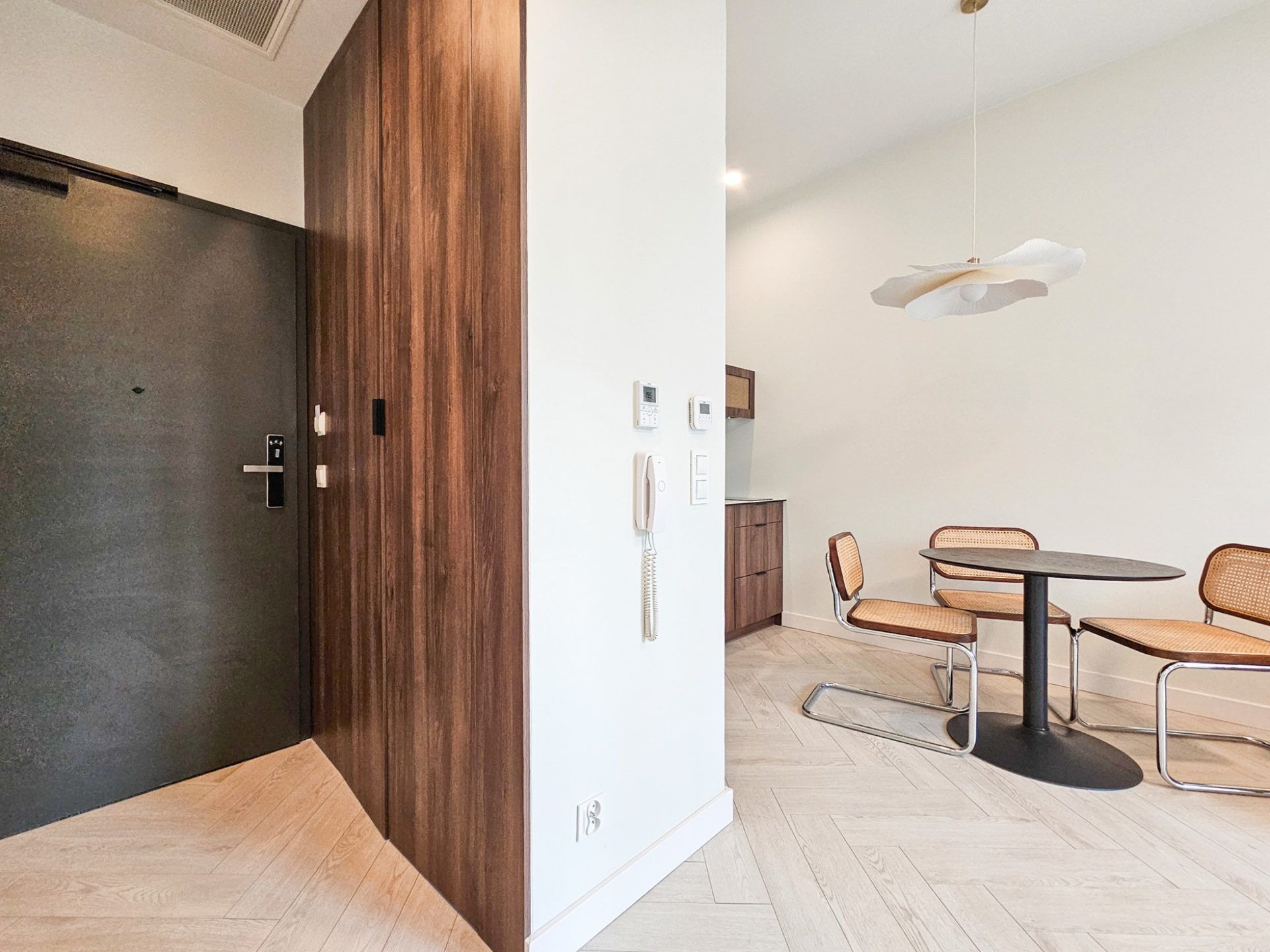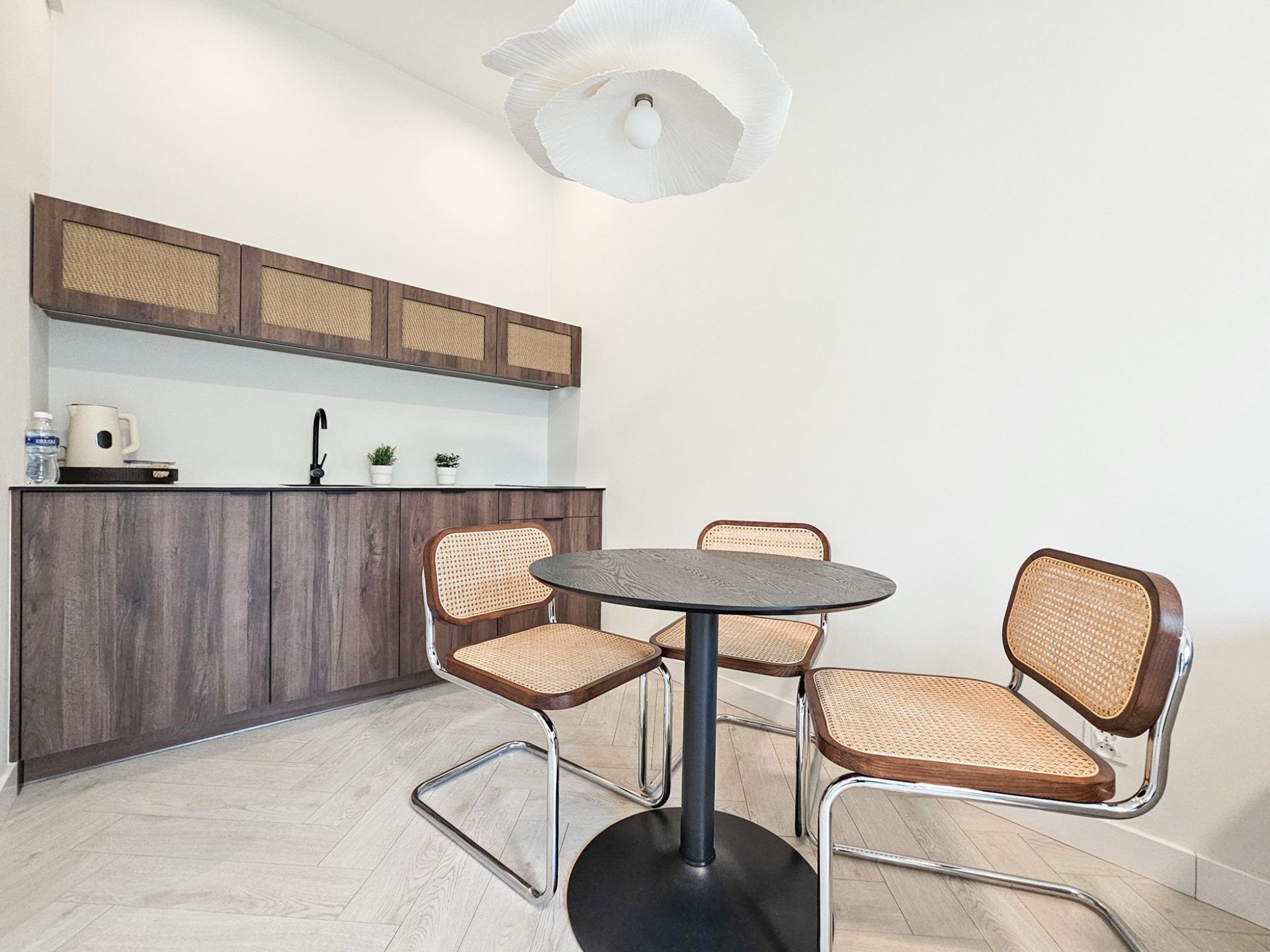Wnętrze apartamentu utrzymane jest w spójnym, designerskim stylu. Jasna kolorystyka, naturalne drewno, starannie dobrane dodatki oraz wysokie sufity tworzą przestrzeń pełną światła i harmonii. Duże przeszklenia otwierają wnętrze na zieleń, dzięki czemu pobyt nabiera wyjątkowego, relaksującego charakteru.